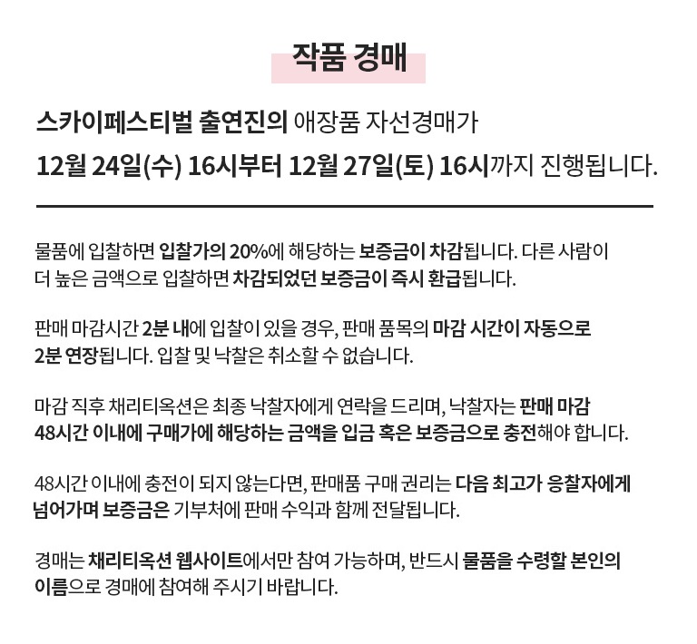 2025년 스카이페스티벌 출연진이 직접 기증한 애장품 자선경매는 12월 24일 오후 4시부터 12월 27일 오후 4시까지 채리티옥션 홈페이지에서 진행됩니다. 본 자선 경매 수익금은 CJ도너스캠프와 함께 인천 지역 소외계층 아동, 청소년을 위해 사용될 예정입니다.