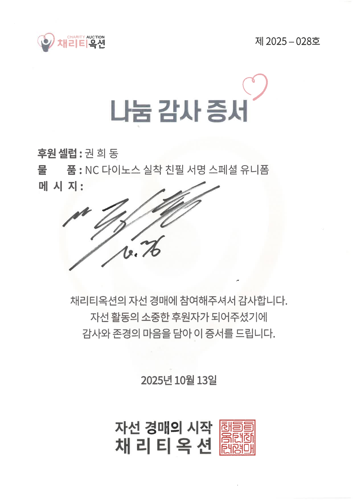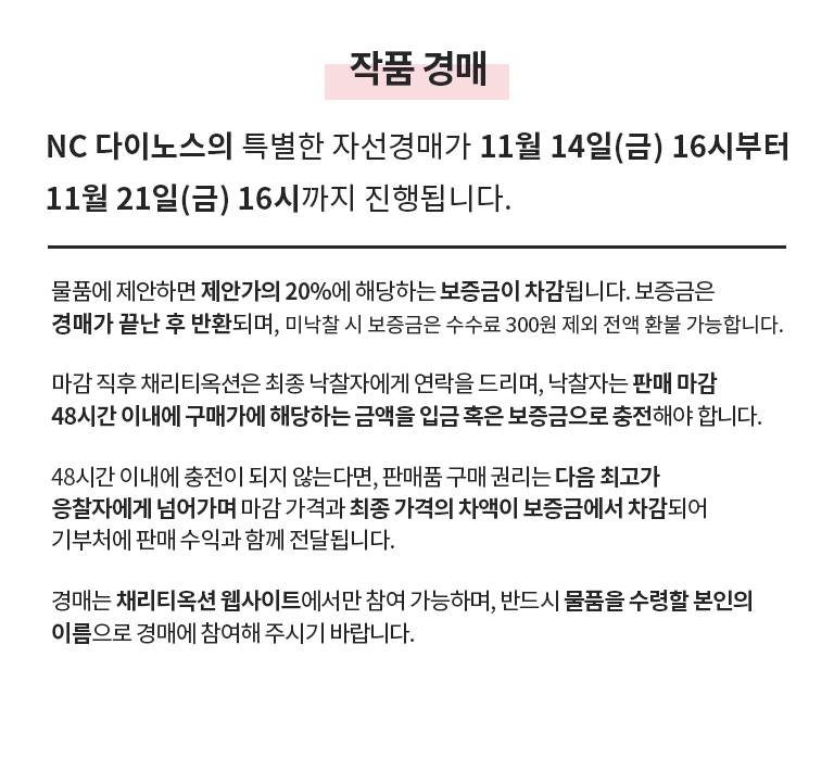 이번 자선경매는 NC 다이노스 선수단이 직접 착용한 스페셜 유니폼을 통해 따뜻한 마음을 전하는 행사로, 유소년들이 꿈을 키워가고, 어려움을 겪는 이웃들이 희망을 이어갈 수 있도록 여러분의 참여가 소중한 힘이 됩니다. NC 다이노스 선수들과 함께, 세상을 밝히는 응원의 홈런에 동참해주세요! ⚾💙